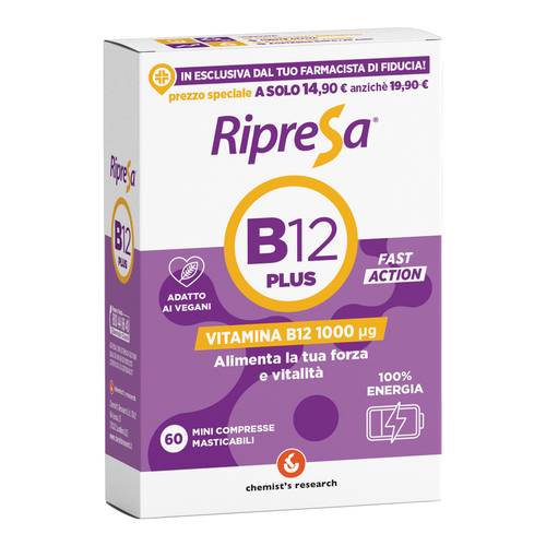 RipreSa B12PLUS Descrizione Integratore concentrato di vitamina B12, formulato in maniera specifica per sostenere forza e vitalità nei casi di stanchezza fisica e mentale, supporta ulteriori vantaggi: metabolismo energetico: favorisce la trasformazione delle sostanze nutritive contenute nel cibo in energia; mente attiva: aiuta il regolare funzionamento del sistema nervoso e l'efficienza della funzione psicologica; sviluppo del sangue: contribuisce alla normale formazione dei globuli rossi; sostegno dopo i 50 anni: con l'aumentare dell'età dell'organismo tende a diminuire l'assorbimento di vitamina B12. Ingredienti Agente d...