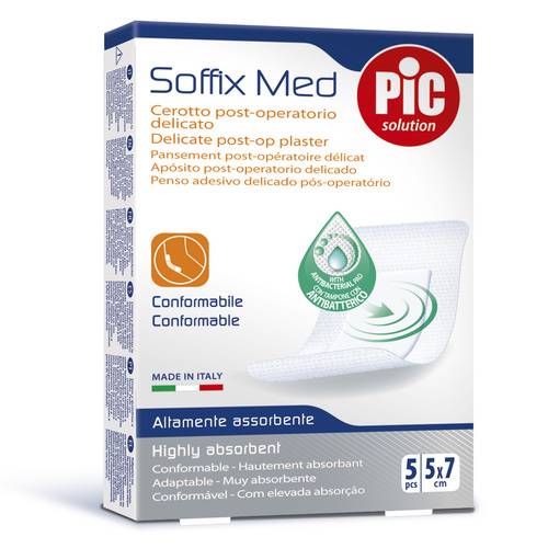 PIC Soffix Med Cerotto post-operatorio delicato Medicazione in tessuto non tessuto per ferite chirurgiche ed estese con tampone con antibatterico (Clorexidina). Traspirante e altamente assorbente. Protegge la ferita dai rischi di infezione, grazie all’azione ad ampio raggio della Clorexidina. In più, è un cerotto post-operatorio conformabile, morbido e traspirante pensato apposta per le pelli più sensibili e delicate. Formato 5 Cerotti cm 5 x 7 cm Cod. 0002600000000